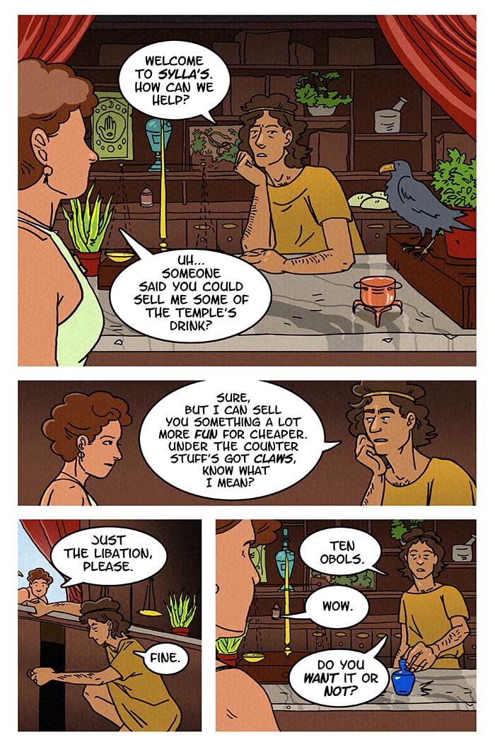 The shopkeeper’s character design is inspired by Hades, from the wonderful webcomic Theia Mania by Agnosis: https://theiamania.thecomicseries.com